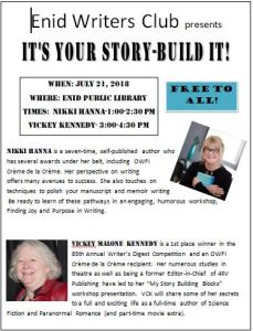 Saturday July 21, 2018 Enid Writers Club will host a free writing workshop at the Enid Public Library, 120 West Maine, Enid, OK 73701, from 1-4:30. Please join us in the Great Plains Room upstairs in the library for an afternoon of fun and learning as Nikki Hannah, of Tulsa, and Vickey Kennedy, of Norman, dazzle us. Come see what they have to say.