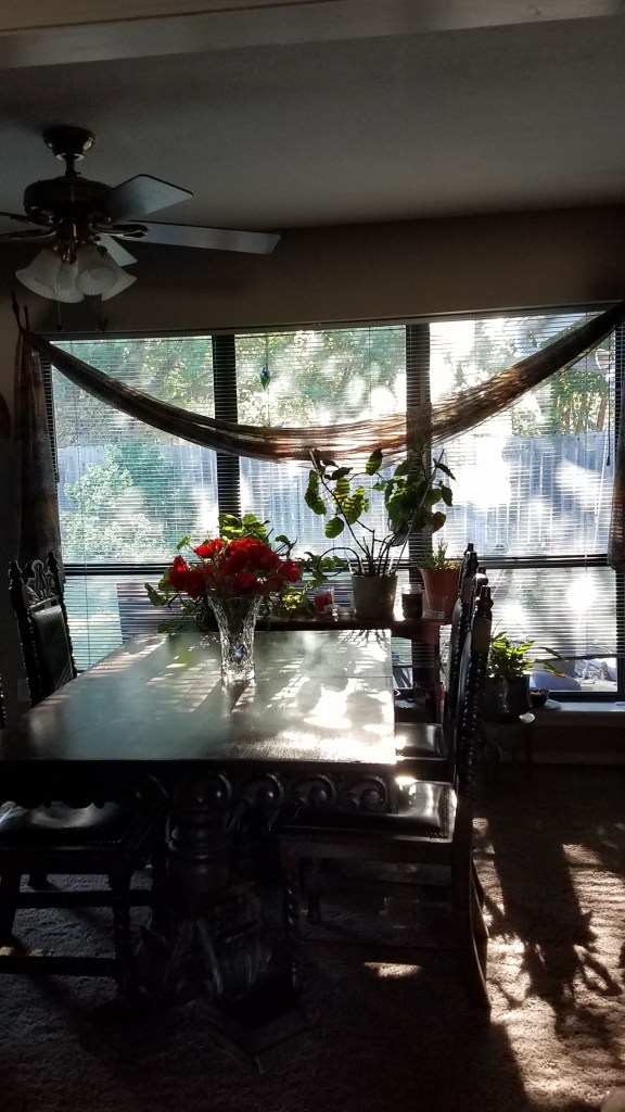 On my way out the door for an early walk I glanced back and saw this site. My own dining room in the morning sun. I see this room daily. I dust the room that seldom gets used now that there are only two in the house. I often talk about getting rid of the antique furniture and turn it into a den. I gripe about the neighbor’s trees leaning on my fence and shading my grass so it doesn’t grow as it should. But this morning I stared at the way the light filtered through the trees and across the dusty table—and I saw beauty.
