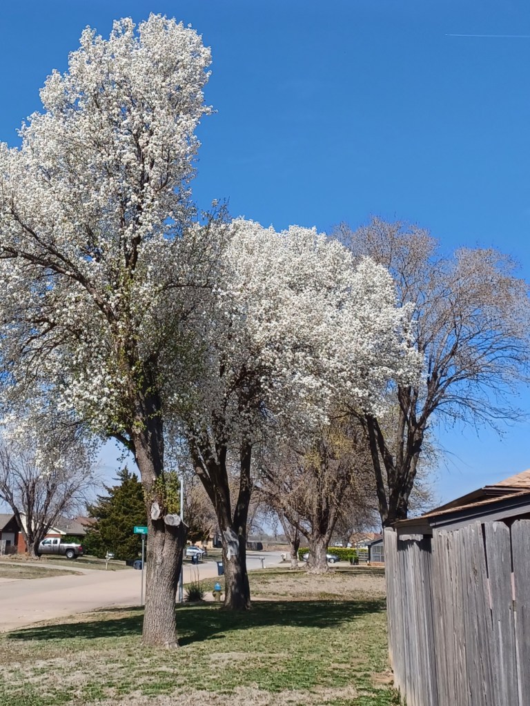 It’s spring! Well, according to the calendar, we have about 10 days but just look at this beautiful white cloud. I know people say that Bradford Pears are invasive, they break easily in the Oklahoma winds, and then there’s the allergies. But no one talks about how beautiful they are. They are the first thing to bloom in the spring and the first thing to turn red in the fall. I love them. Achoo! Sorry.