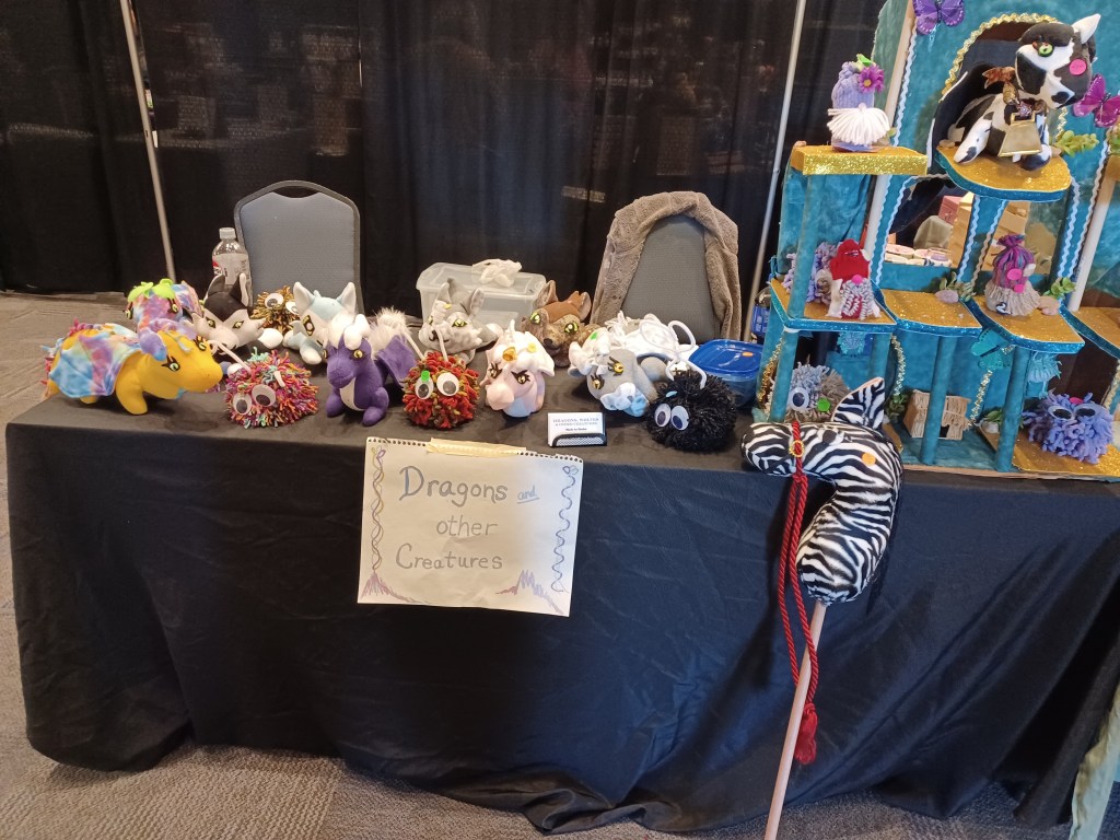 My sister sells stuffed animals made by hand: dragons, gnomes, wolf pups, and puff balls with googly eyes. They sit on a dragon mountain and attract a lot of attention.