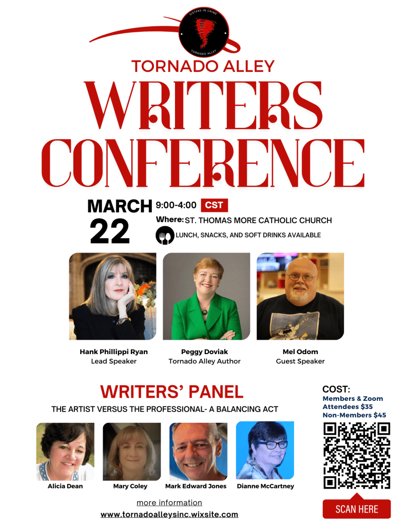The other speakers include Peggy Doviak (Financial Tips for Writers) and Mel Odem (What Writers Need to Know about AI). There will be a panel discussion in the afternoon discussing The Artist versus the Professional—A Balancing Act with Alicia Dean, Mary Coley, Mark E. Jones, and Dianne McCartney.