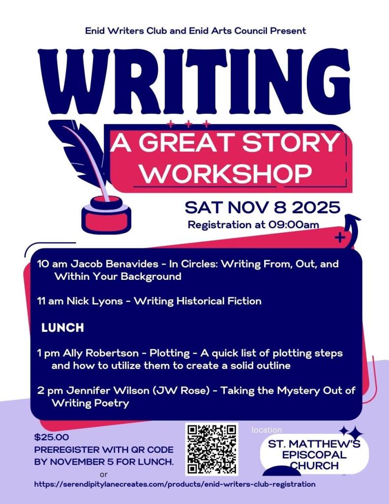 The Enid Writers Club, and Enid Arts Council, present their annual fall writing workshop “Writing a Great Story!” on November 8, 2025, at St Matthews Episcopal Church, 518 West Randolph, Enid, OK 73703. Preregistration is required and it is only $25.
