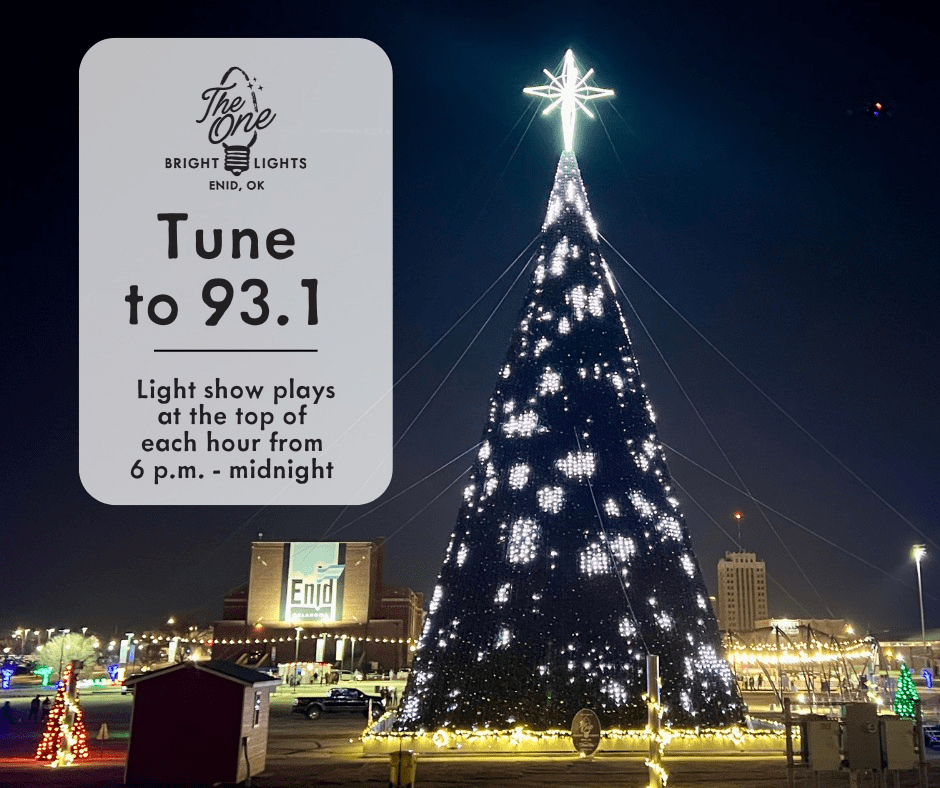 A few years ago, Enid came up with the idea of a huge Christmas tree downtown called The One, and a Christmas village to go with it. It has grown. The tree is now artificial and lit with lights that coordinate with radio station, FM 93.1, which plays Christmas carols. There is a kiddie train ride that is pulled by a decorated tractor and drives around the park with kids in the cars. A trolly takes people around the downtown area so they can see the courthouse square and the lights there.