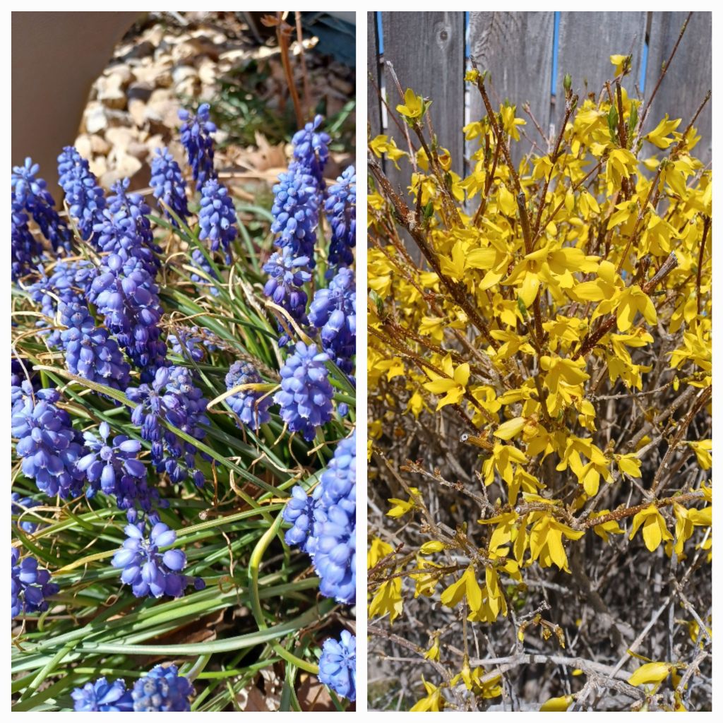 It’s spring in Oklahoma! The first day was Friday and it was in the nineties. It might snow yet. Love those April snows, thick and don’t last too long. And we may break one hundred degrees. You never know. But my grape hyacinths and forsythia are blooming! The irises are standing up looking like they are thinking about spring blooms, and I have trouble bending over to tend them after back surgery last fall. I am thinking I might sit down and clean them out and then struggle to get back up. No matter how old I get, I still want to garden. Or maybe I should write about it and not get my hands dirty. We’ll see.